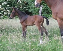 St.Pr.Stute Grafina jetzt mit ihrem 10. Fohlen, davon das 3. Hengtfohlen. Dieser junge Mann von dem Diamant de Semilly Sohn Mumbai, der letztes Jahr 7 jährig bereits S** gewonnen hat und vor Corona bereits in 1,55 m Springen Anfang 2020 unterwegs gewesen ist, gefällt durch sein sehr korrektes Gebäude bei viel Charme.