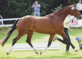 Diese hochnoble Tochter von Graf Top aus unserer Staatsprämienstute Farina haben wir für unsere eigene Zucht behalten. Der Vater Graf Top bringt weitere höchst interessante Springgene ins Pedigree. Dessen Vater Graf Grannus war selbst in Hannover zum Hengst des Jahres gekürt worden. Er stammt ab von einem weiteren Spitzenvererber in der Springpferdezucht, dem legendären Grannus. Als Muttervater des Graf Top tritt wiederum Calypso II in Erscheinung und es folgen Gotthard und Steinpilz xx.
